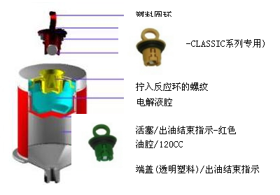 將塑料反應(yīng)環(huán)擰入加油器,直到圓環(huán)被擰斷,環(huán)內(nèi)的金屬球被壓入電解液里并發(fā)生化學(xué)反應(yīng)。化學(xué)反應(yīng)產(chǎn)生氣體,氣體越多,壓力越大,使活塞產(chǎn)生向前運動,潤滑脂/油就會連續(xù)不斷地被擠出注入到加油嘴里。當(dāng)潤滑油用完時,出口端的塑料蓋會看到活塞的紅色,表明加油器內(nèi)的脂/油已用盡,應(yīng)該及時更換新的加油器。