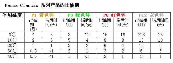 擰入反應(yīng)環(huán)和擠出潤滑油或脂之間的滯后時間,會因使用不同型號的加油器和不同顏色的反應(yīng)環(huán)而有所不同。使用不同顏色的反應(yīng)環(huán),出油時間就不一樣:黃色-1個月,綠色-3個月,紅色-6個月,灰色-12個月。具體請參考下表。