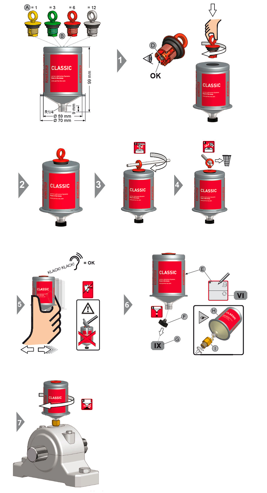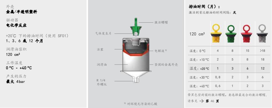 perma CLASSIC 可在 0 °C - +40 °C 的環境溫度下使用,其基于電化學反應的工作原理 安全可靠。其潤滑周期取決于按顏色編碼的激活螺帽。根據應用的具體需求,您可以 分別選擇在 1、3、6 或 12 個月內排完 120 cm3 潤滑油。由激活螺帽產生的壓力(最 大 4 bar)可推動活塞向前移動,這樣就可以持續不斷地將潤滑油一點一點地注入潤滑 點。perma CLASSIC 還能完全防塵和防水,并能承受撞擊和意外碰撞。